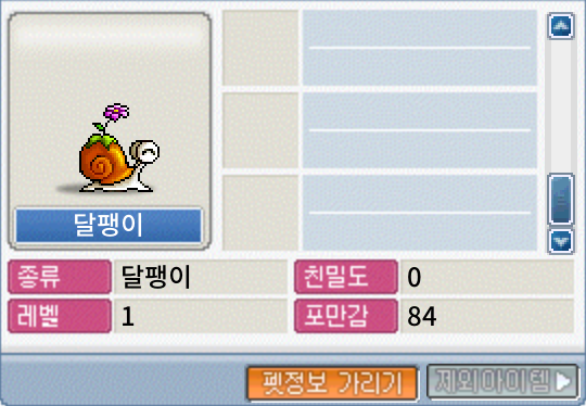자기 캐릭터에 마우스를 대고 더블클릭하면 캐릭터 정보와 함께 위 캡쳐화면과 같은 펫정보가 표시됩니다. 여기에 포만감이라는 수치를 보실 수 있는데요. 이 포만감은 그냥 시간이 지날수록 점차 떨어지게 되고 포만감이 0에 달하면 달팽이는 저절로 소환이 풀리고 캐시템으로 돌아가게 됩니다.