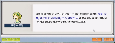 연금술사 제인3 | 고목 나무수액 10개 용의 가죽 20개 달의돌 1개 | 경험치 2,500 장갑공격력주문서 10% 또는 60% 랜덤 |