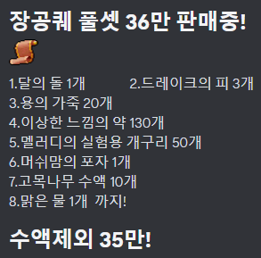 디코 서치해보니까 장공퀘 재료 풀셋을 일괄적으로 36만 메소에 판매중이더라구요...! (고목나무 수액10개를 제외한 가격은 35만 메소) 장공10% 가격이 약 200만 메소이고 장공60%는 약 300만 메소인 점을 감안했을 때 이건 뭐 어떻게 하든 남는 장사겠네요. 약 36만 메소 투자해서 최소 200만 메소를 거머쥘 수 있으니 말이죠.