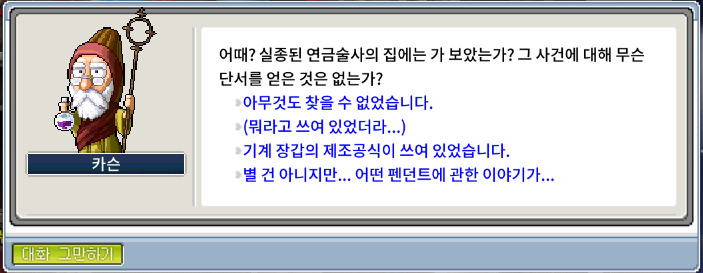 연금술사의 집 위로 올라가서 스티커 표시가 있는 영역을 여러번 클릭하다보면 위 첨부 이미지와 같이 뭔가 발견됐다는 창이 뜹니다. 그리고 다시 NPC 카슨에게 돌아갑니다.