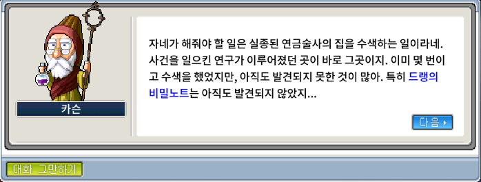 마가티아 제뮤니스트 협회 NPC 카슨에게 대화를 걸면 실종된 연금술사의 집을 수색하여 <드랭의 비밀노트>를 찾아달라고 합니다.